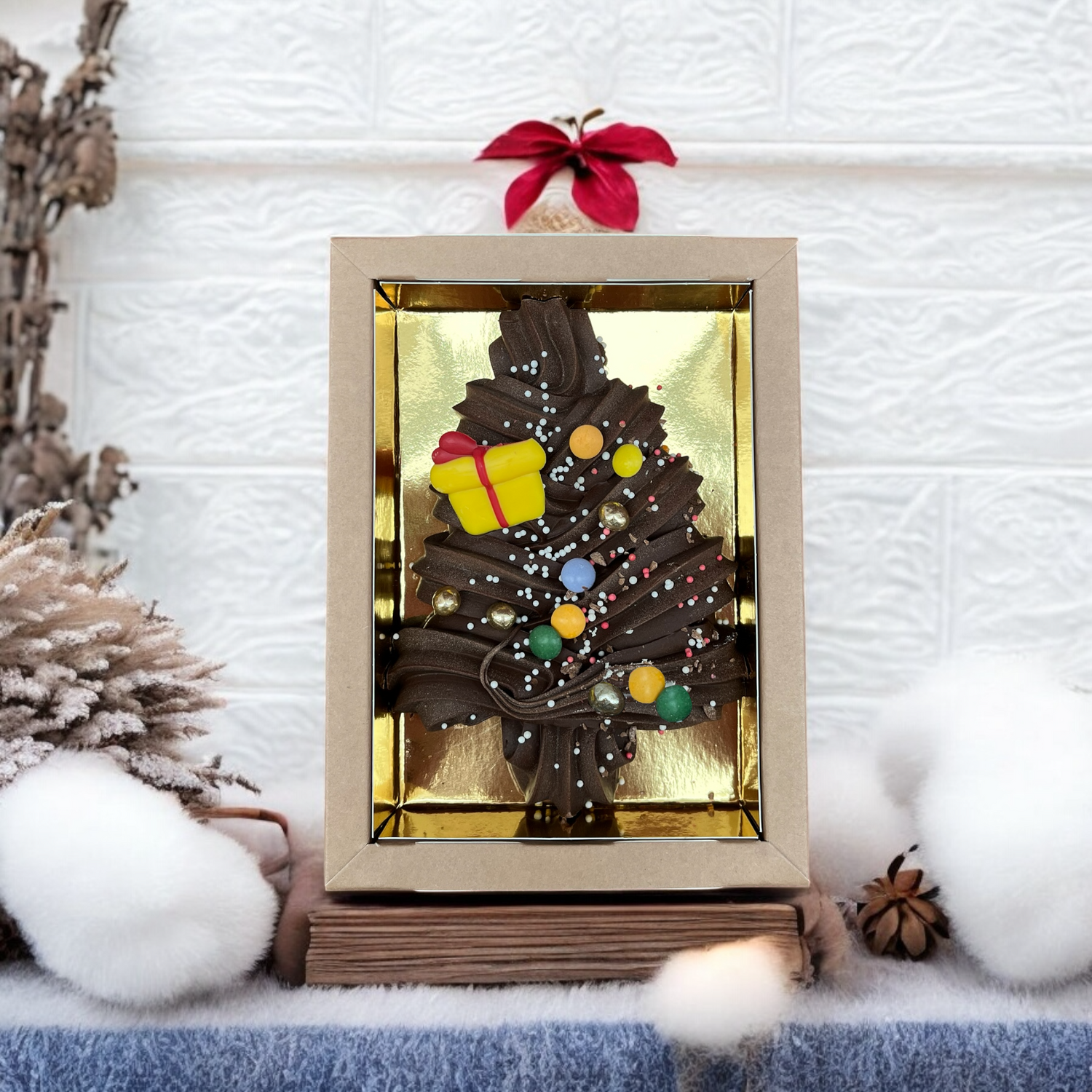 Deze ambachtelijk gespoten chocoladekerstboom wordt gemaakt in een bakkerij waar vrouwen die te maken hebben gehad met ernstig fysiek geweld werken aan herstel, zelfvertrouwen en het opbouwen van een positieve toekomst.