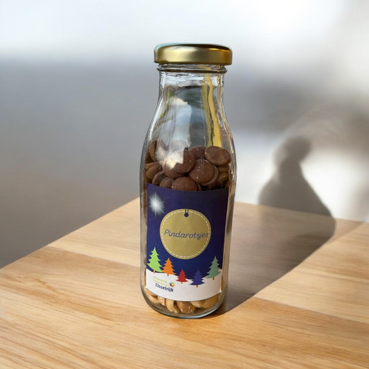 Dit doosje met pindarotsjes is een heerlijke traktatie en een mooi gebaar. Met zorg verpakt door jongvolwassenen met een afstand tot de arbeidsmarkt.