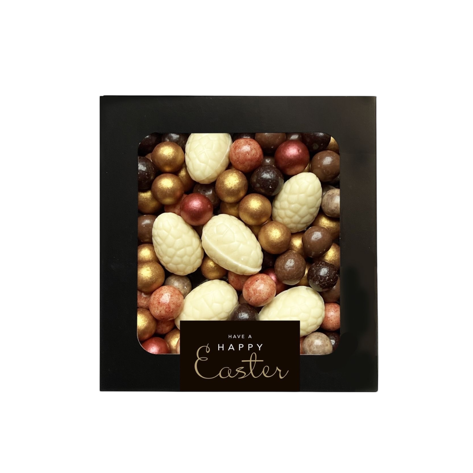 Een stijlvol doosje met een luxe uitstraling, gevuld met 185 gram bonbon paaseitjes wit en crispiebollen.