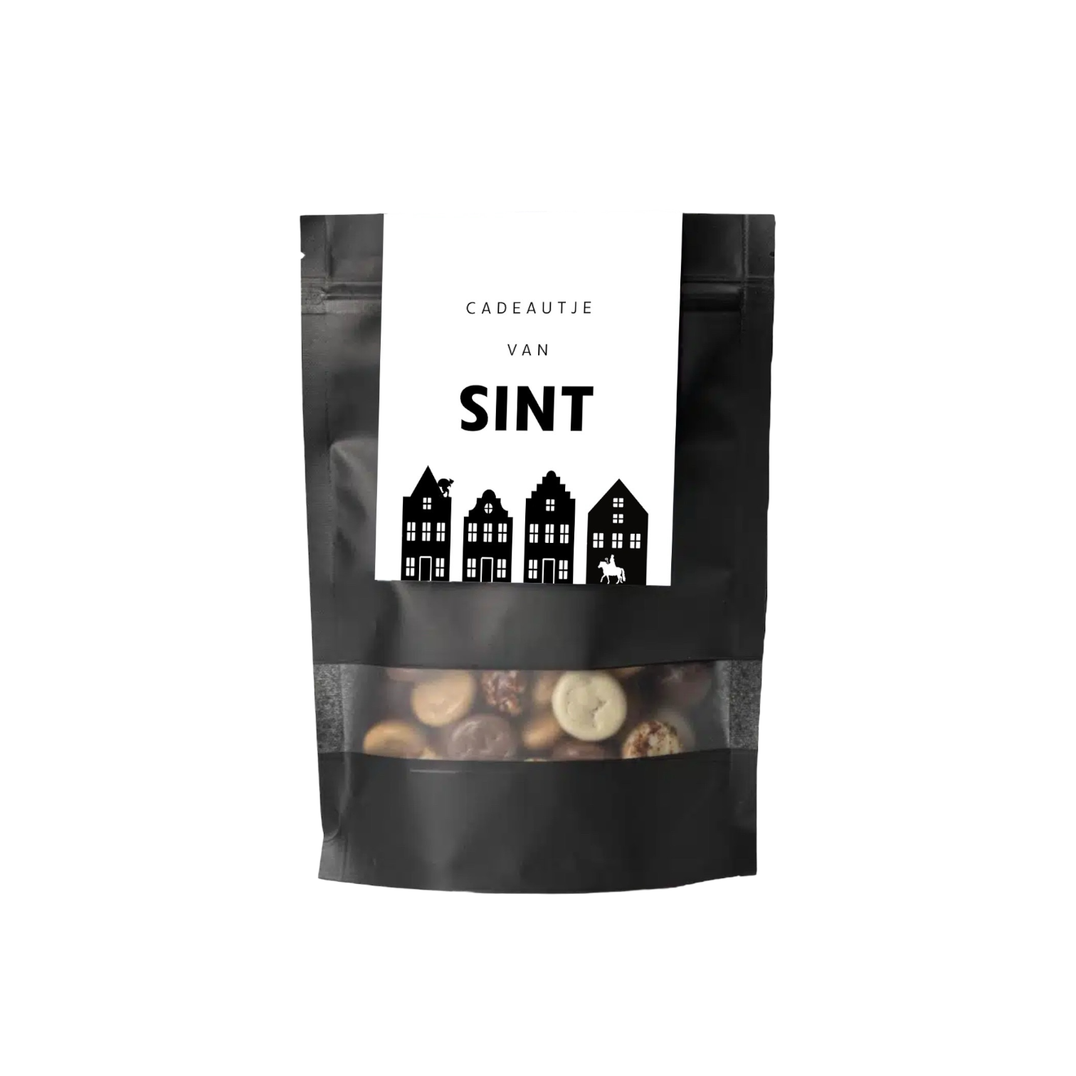 Choco-kruidnotenmix in leuke stazak. Verpakt met zorg door een sociale werkplaats, voor een cadeau dat niet alleen lekker is, maar ook bijdraagt aan werk voor mensen met een afstand tot de arbeidsmarkt.