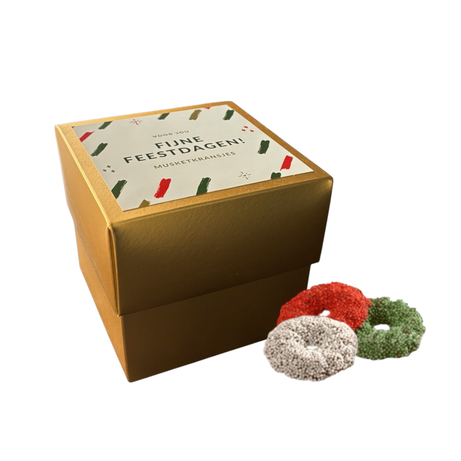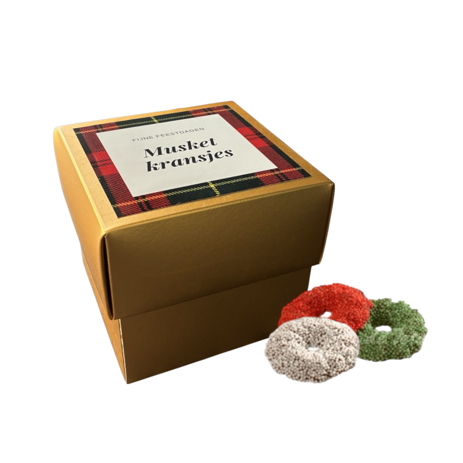 Een stijlvol doosje gevuld met rood, wit en groene musketkransjes. Met zorg gemaakt door een social enterprise en met aandacht ingepakt door jongvolwassenen uit een sociale werkplaats.