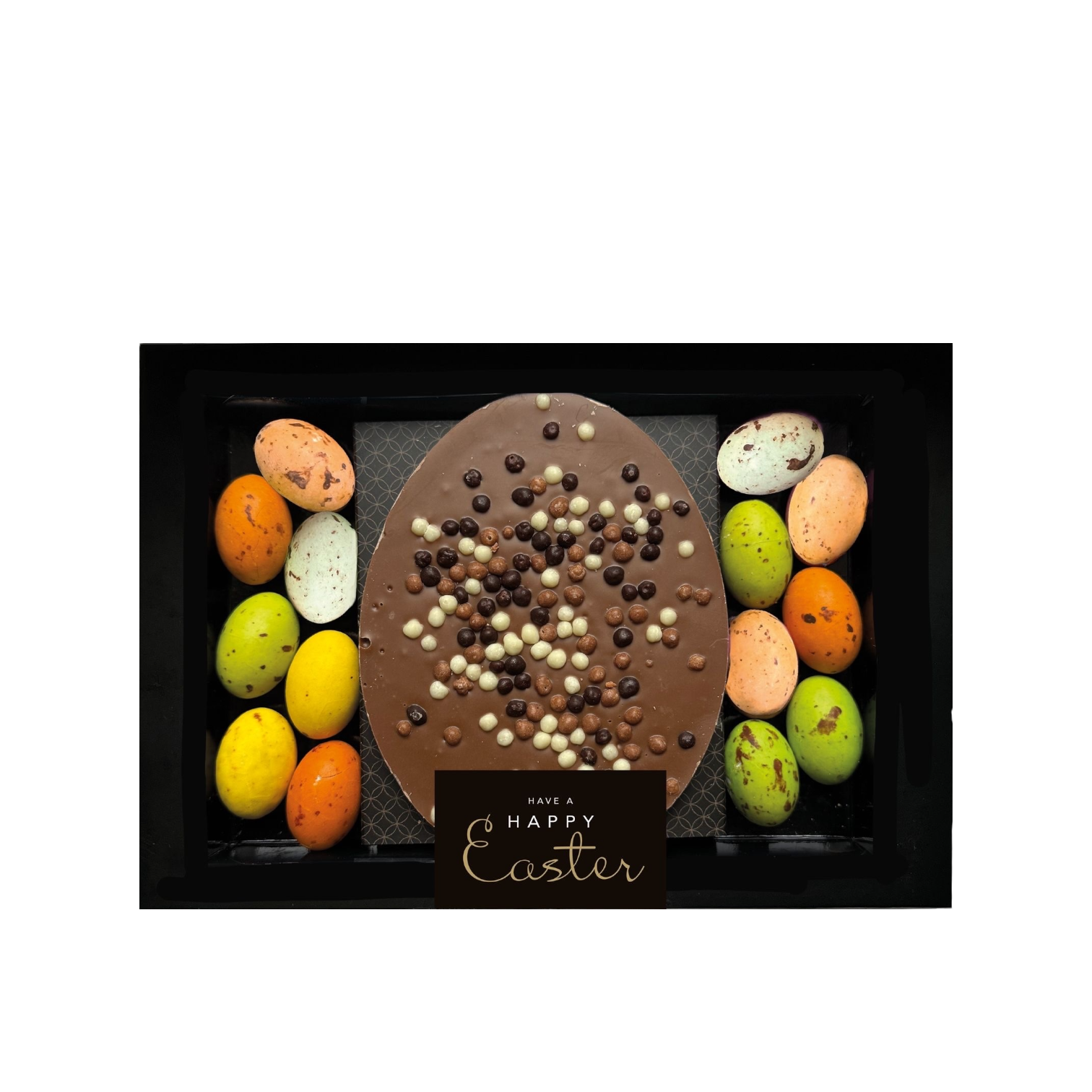 Gevuld met een plat chocolade ei en een heerlijke mix van pure chocolade- en roomkievitseitjes met een krokant suikerlaagje.
