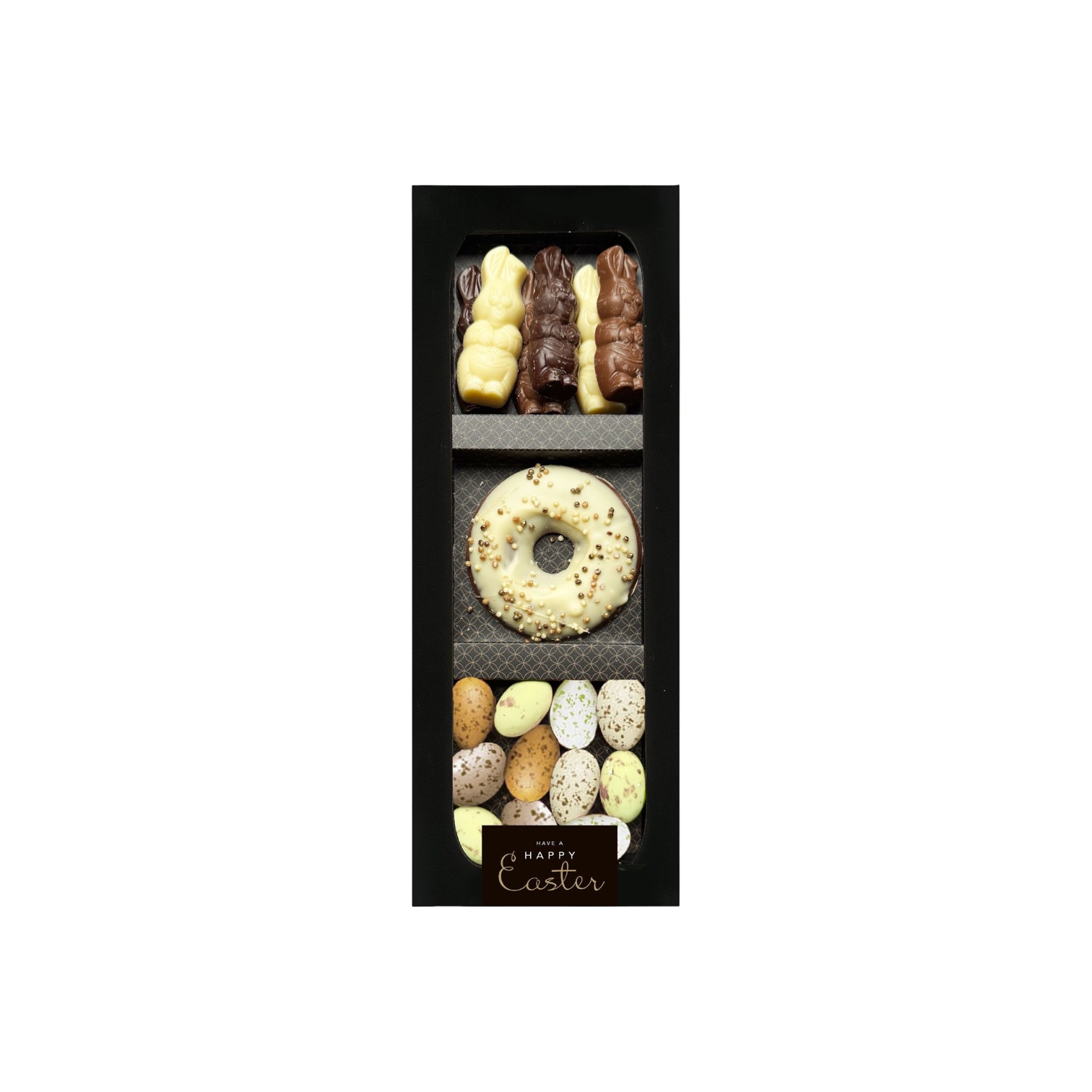Een luxe doos met drie vakken en een verfijnde uitstraling, gevuld met een zorgvuldig samengestelde selectie chocolade: chocoladehaasjes en een gevulde chocoladedonut–kievitsei mix in wit- en beigetinten. De totale inhoud bedraagt 200 gram.