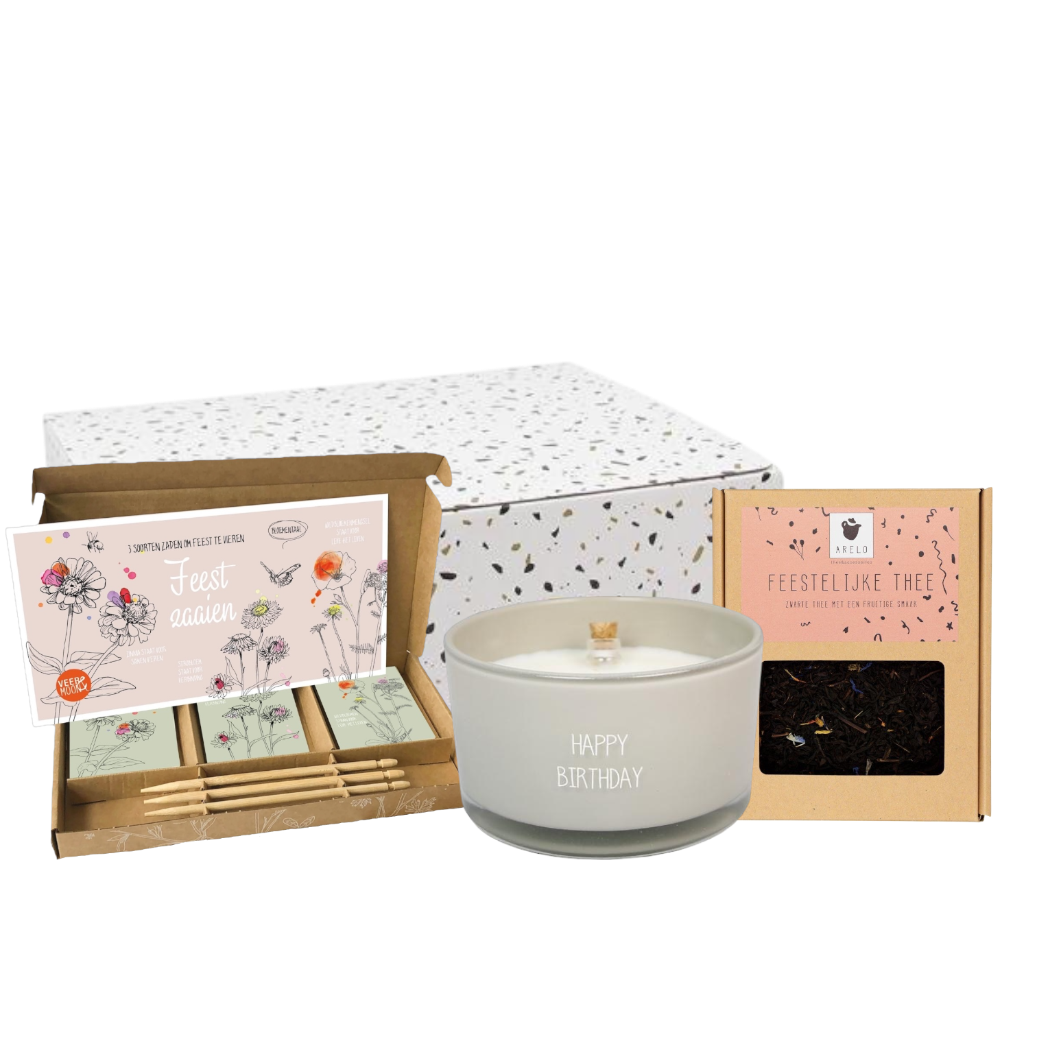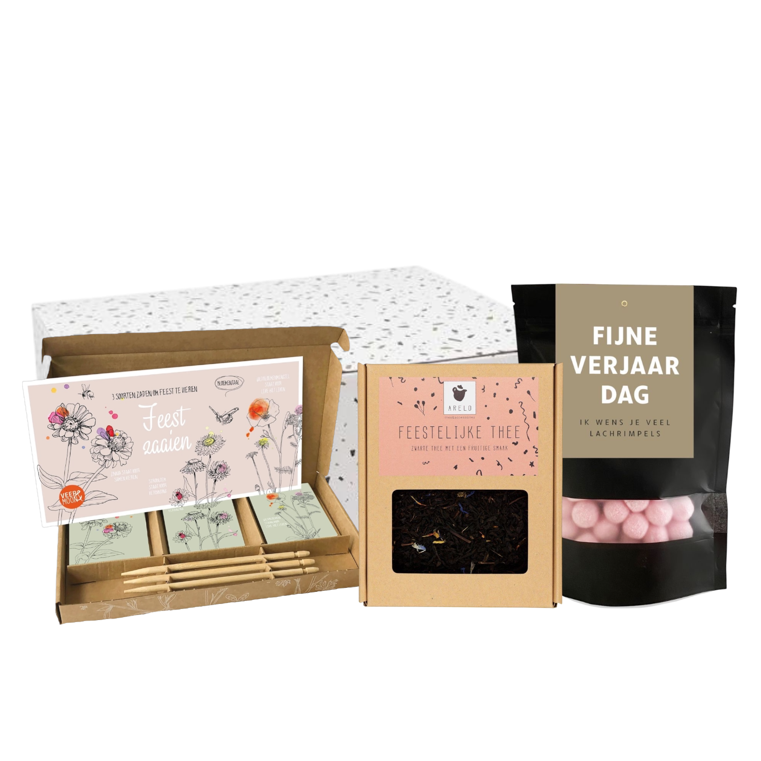 Cadeaudoosje Feest met drie soorten zaden: zinnia, strobloemen en wildbloemen. Inclusief drie labels met stokjes en een kaart met tips om je feest te versieren met (droog)bloemen. Past door de brievenbus.